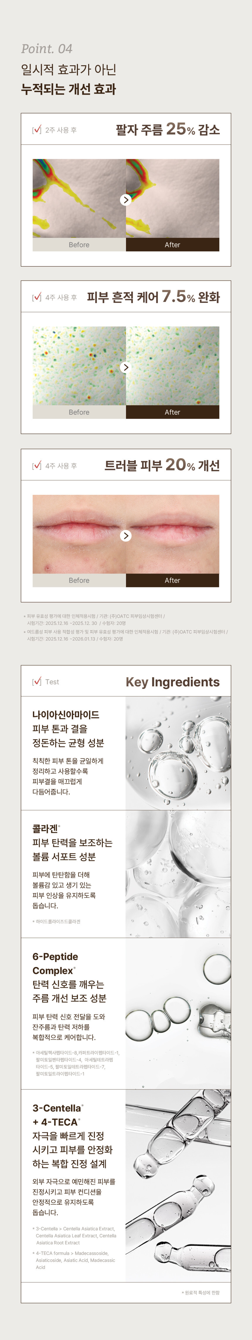搭配 6種胜肽、膠原蛋白、3-Centella + 4-TECA、神經醯胺等屏障修護成分, 深層保濕同時改善膚況穩定度。