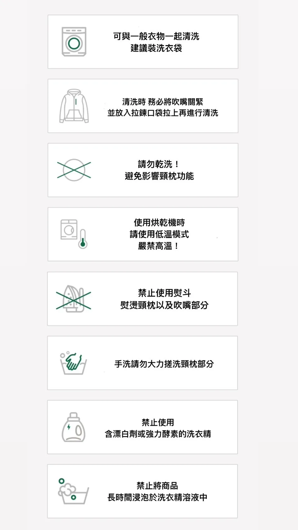 請避免 乾洗 (Dry Cleaning),以免影響頸枕功能